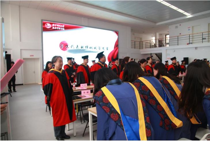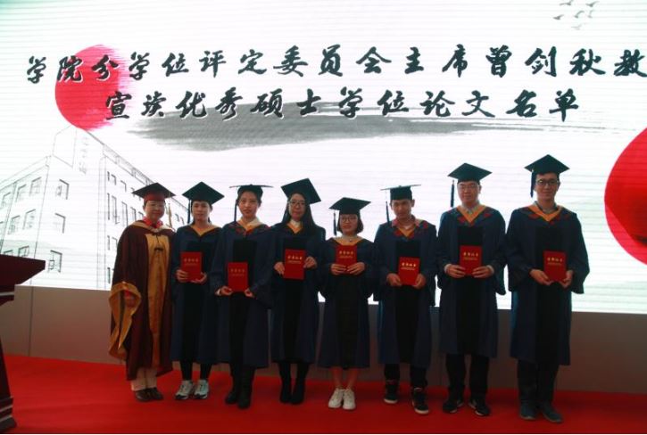 在对母校的不舍和对即将开始的新生活的期待中,毕业生依次上台接受学位授予。院长王欢教授、学院分学位评定委员会主席曾剑秋教授、副院长闫强教授和副院长马晓飞副教授为毕业生拨苏正冠,授予硕士学位并合影留念。在熟悉的校歌和热烈的掌声中,毕业典礼暨学位授予仪式圆满结束。