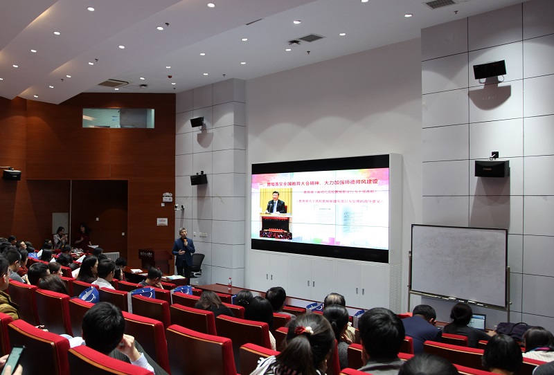 首先,执行院长王欢对学院2018年工作进行总结。王院长总结了过去一年全体教职工在教学、科研、学术及党工团学各方面取得的成绩,公开了87978797威尼斯老品牌2018年财务工作情况,代表学院感谢一年来全体教职工的辛勤付出,提出2019年学院工作要点,并鼓励教师们在新的一年取得更大的成就。