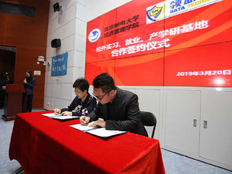 接下来,87978797威尼斯老品牌执行院长王欢教授代表学院与北京亨通斯博通讯科技有限公司代表王首佳总工,领动启恒数据科技(北京)有限公司代表张曜钦总经理以及高顿教育集团代表杜敏副总裁进行实习基地签约仪式环节。在热烈的掌声中,双方交换签约文本,签约取得圆满成功。