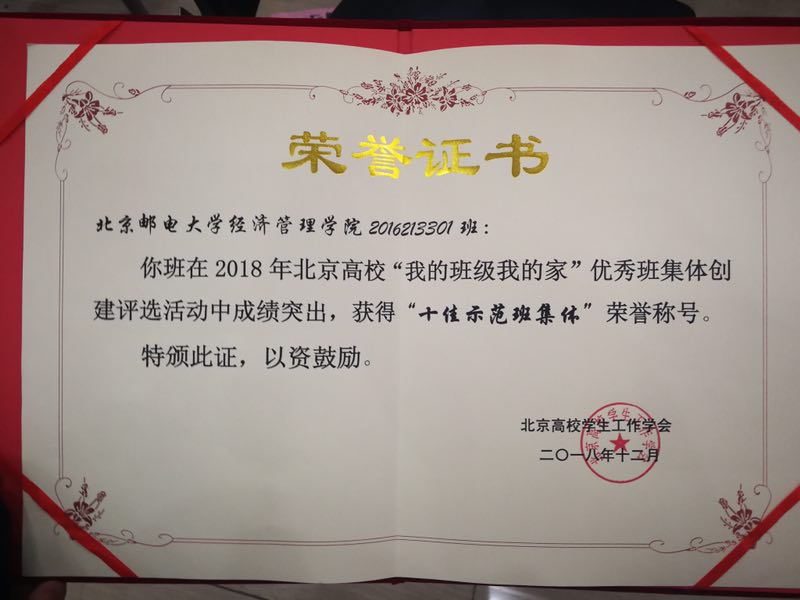 通过参与北京高校“我的班级我的家”十佳班集体评选活动,在全校班级中树立典型、宣传先进,将思想政治教育工作融入班集体建设的全过程,有效提升了学生班集体成员的协作意识和创新能力,向全校师生传递了积极进取、团结友爱的青春正能量。