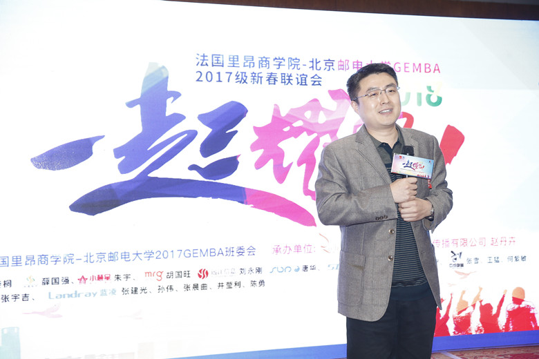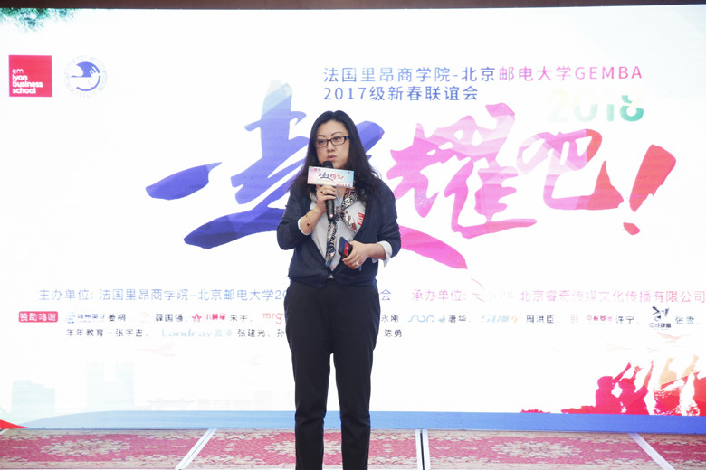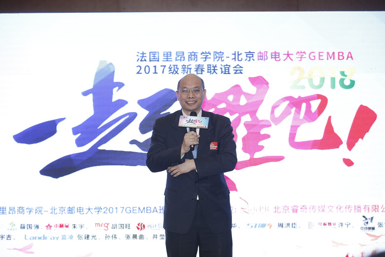 法国里昂商学院高管教育部主任袁朔在致辞中表示,很高兴看到17级积极热情的举办晚会活动,相信2018年GEMBA项目会越来越好,法国里昂商学院作为全球1%通过三大认证(EQUIS、AACSB、AMBA)的商学院,学生是商学院重要组成部分,未来将以大家发展为荣。